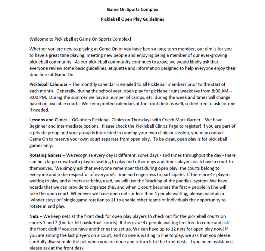 Open Play available from Monday - Friday, 8:00 AM - 3:00 PM at Game On Sports Complex